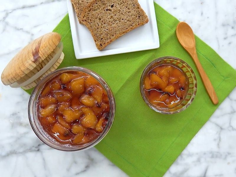 Şeftali reçelini, kızarmış ekmek dilimleri ile servis edebilirsiniz.