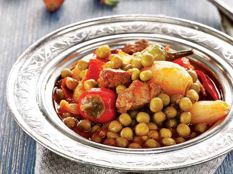 10 dakika pişirdikten sonra bezelye ve sarımsakları ilave edin. Bir taşım kaynatın ve yemeklik doğranmış sivri biber, salçalık kırmızı biber, domates, tuz ve karabiberi ekleyerek kısık ateşte 30 dakika daha pişirin. Yemeği yanında yoğurt veya cacıkla birlikte soğuk olarak servis edin.